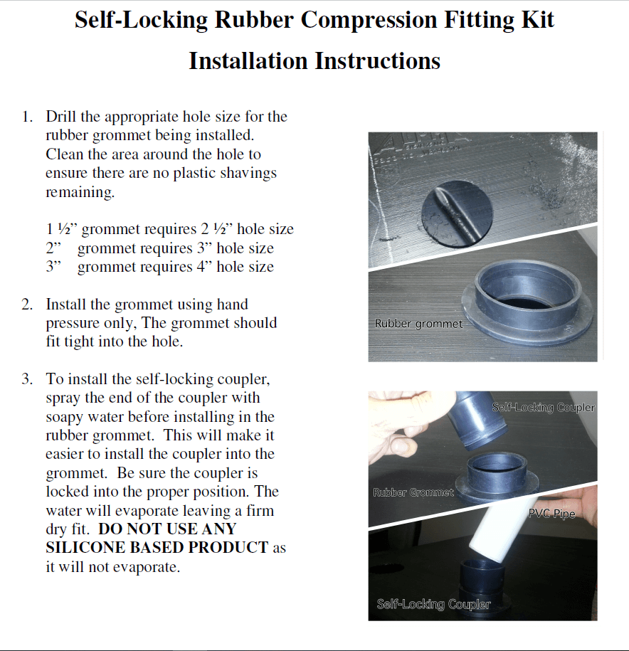 1.5″ Rubber Tank Grommet Kit used on Roto-Molded Black and Gray tanks. Allows ABS pipe to be installed to tanks.
