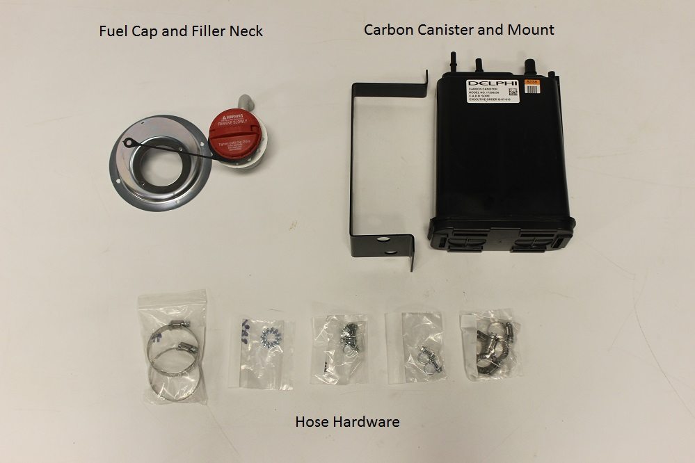 24″ x 27″ x 7″ 20-gallon manger tank (CARB Compliant) comes with gas cap, filler neck and mount, 3.1 carbon canister w/ bracket and hose clamps.