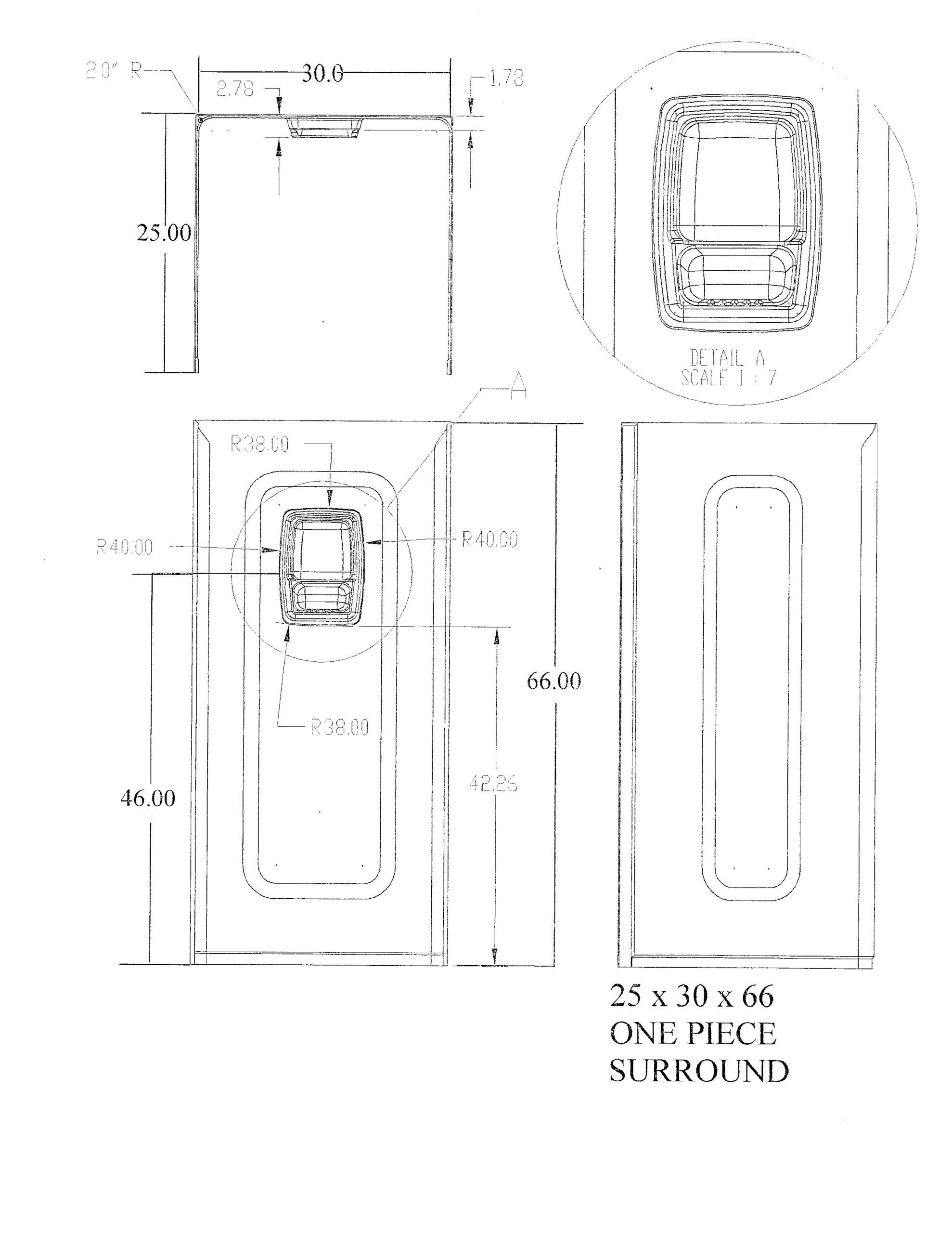 25″ x 30″ x 66″ White One Piece Shower Surround – Includes a soap dish and a shelf for shampoo.