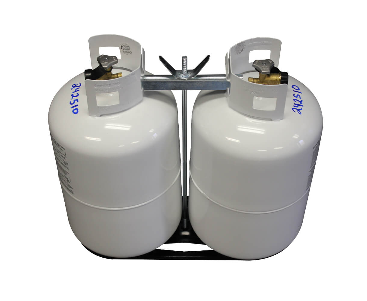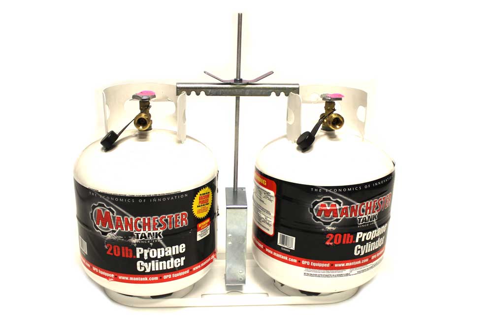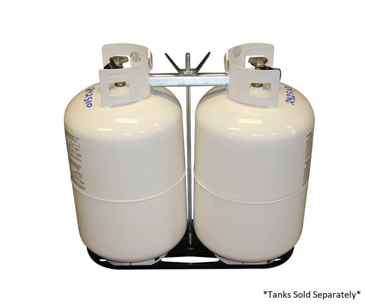 Dual LP rack kit. White dual rack base with hold down bar. Holds 20 and 30 pound LP tanks.