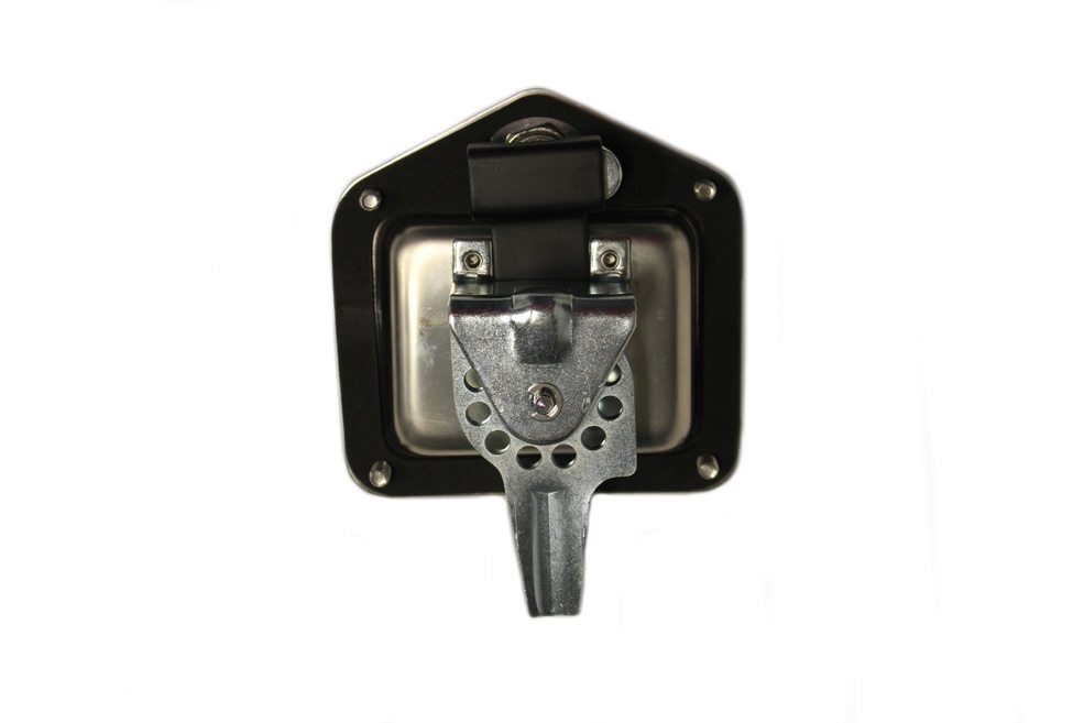 Key-locking T-handle with standard 12-hole V-grooved cam. Single-point lock with adjustable latch for different door thicknesses. Off-center shank permits mounting the T-handle close to the edge of the door. Ideal for use on steel, wood and fiberglass doors.