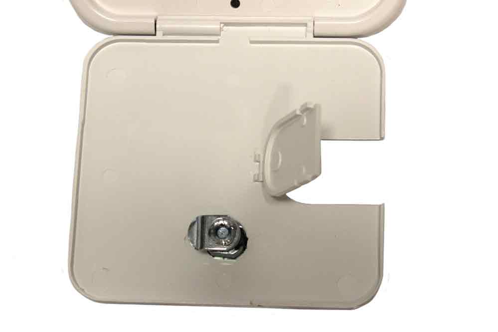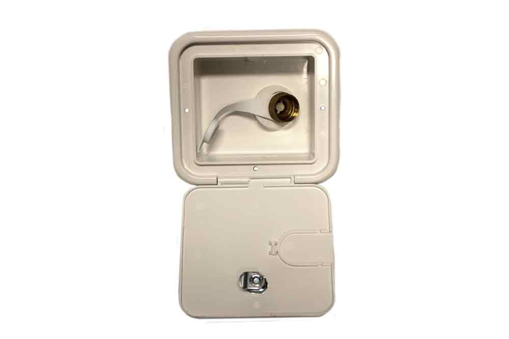 Polar White colored City Water Hatch w/ Key Lock – City water hatch is built to last and resists UV rays and impact. This hatch will not fade or discolor and is paintable with no preparation needed to match any exterior. Designed with a vermin door so you can secure your city water connection while hooked to the water source. Comes with a brass check valve.