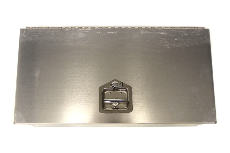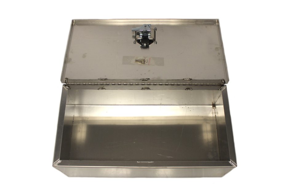 Brushed, 12-gauge aluminum boxes with folding T-handle latch and lock with 2 keys. Each box is made with a full length door hinge. Boxes are opened toward the trailer wall.
