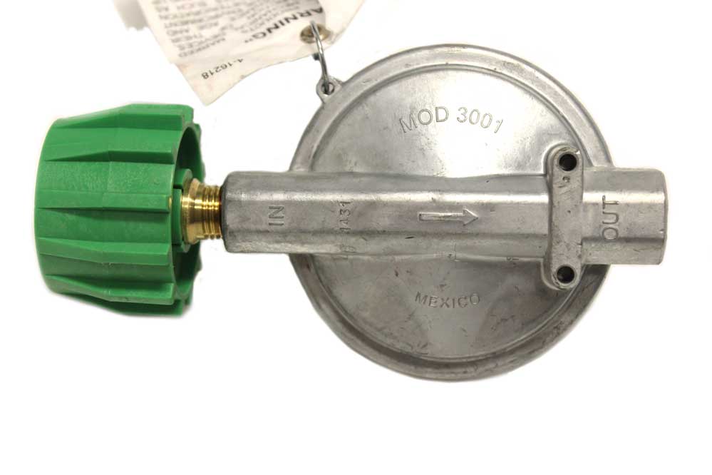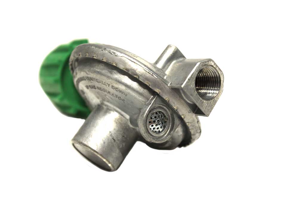 LP Single Stage Regulator. Zinc die cast with molded rubber diaphragm. Mounting holes 3-1/2” on center. 140,000 BTU capacity.