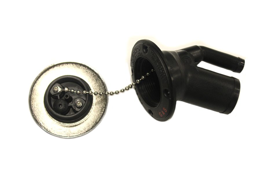 Angled neck, chrome plated bronze cap with black plastic body. Stainless Steel bead chain. Integral tank vent with flame arrestor and anti surge valve. Deck plate key included.