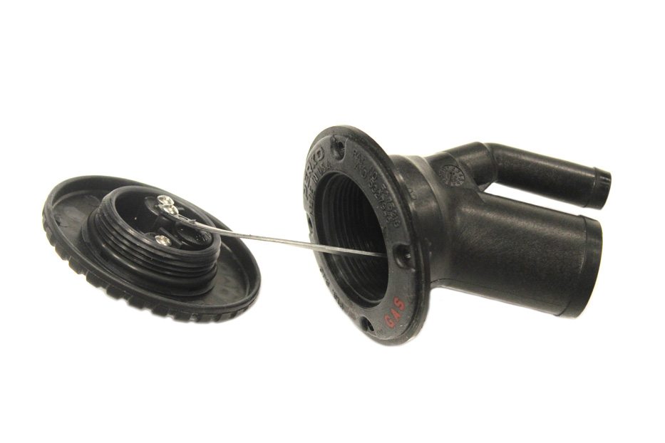 Black plastic cap and angled neck combination fill. Integral tank vent with flame arrestor and anti surge valve. Deck plate key included.