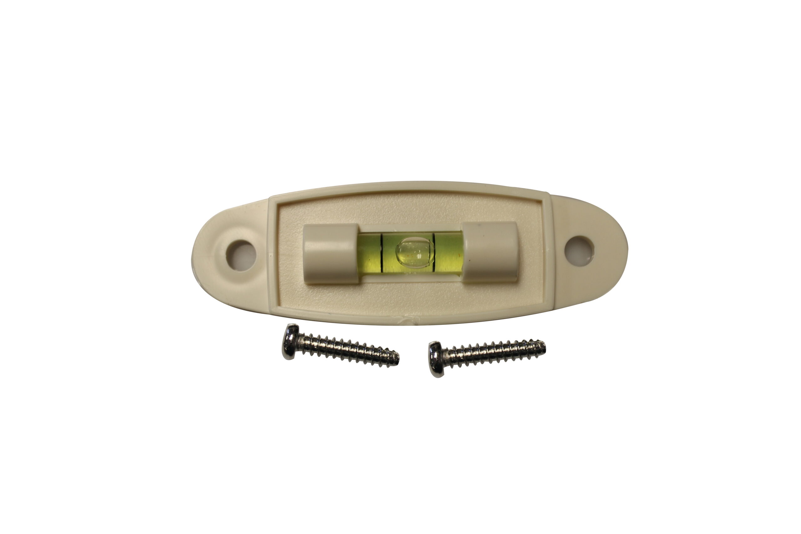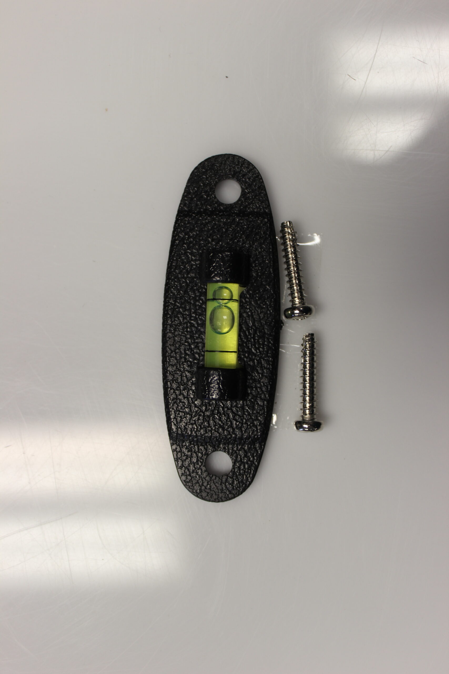 Levels front-to-back and side-to-side. Self-adhering back or screw holes for permanent mounting.
