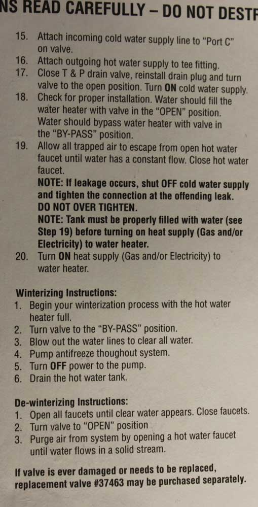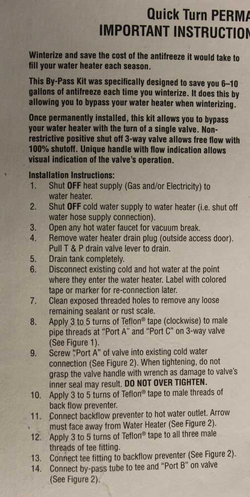 The quick-turn permanent bypass kit allows you to bypass your water heater while winterizing and saving on antifreeze.  Sturdy brass backflow preventer and 100% shut-off valve.